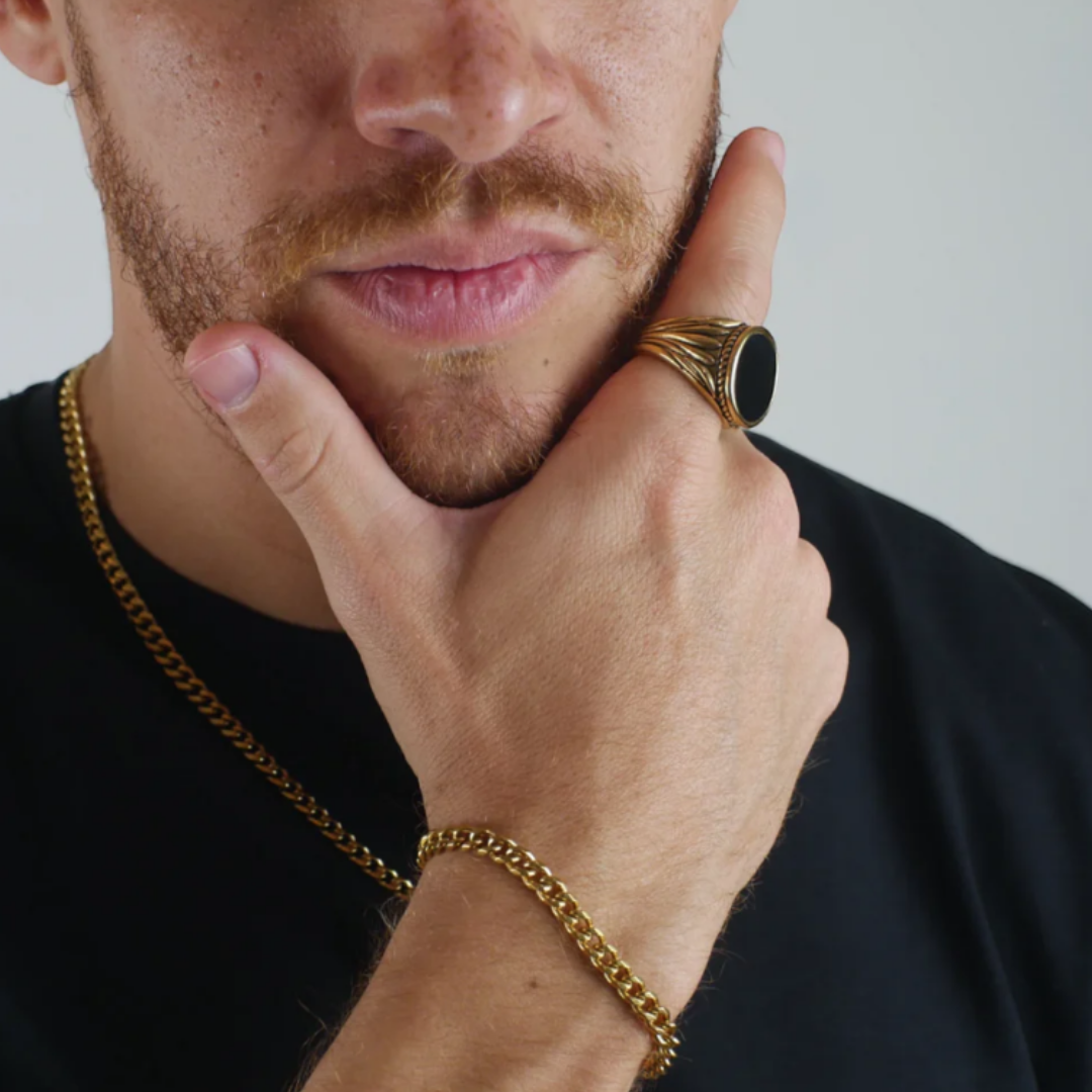 Hecho en acero inoxidable 316L grado quirúrgico de alta resistencia, el mejor acero para joyería del mundo, el color dorado maneja un enchape en oro real de 18k mediante tecnología PVD y sellado con recubrimiento anti deslustre.