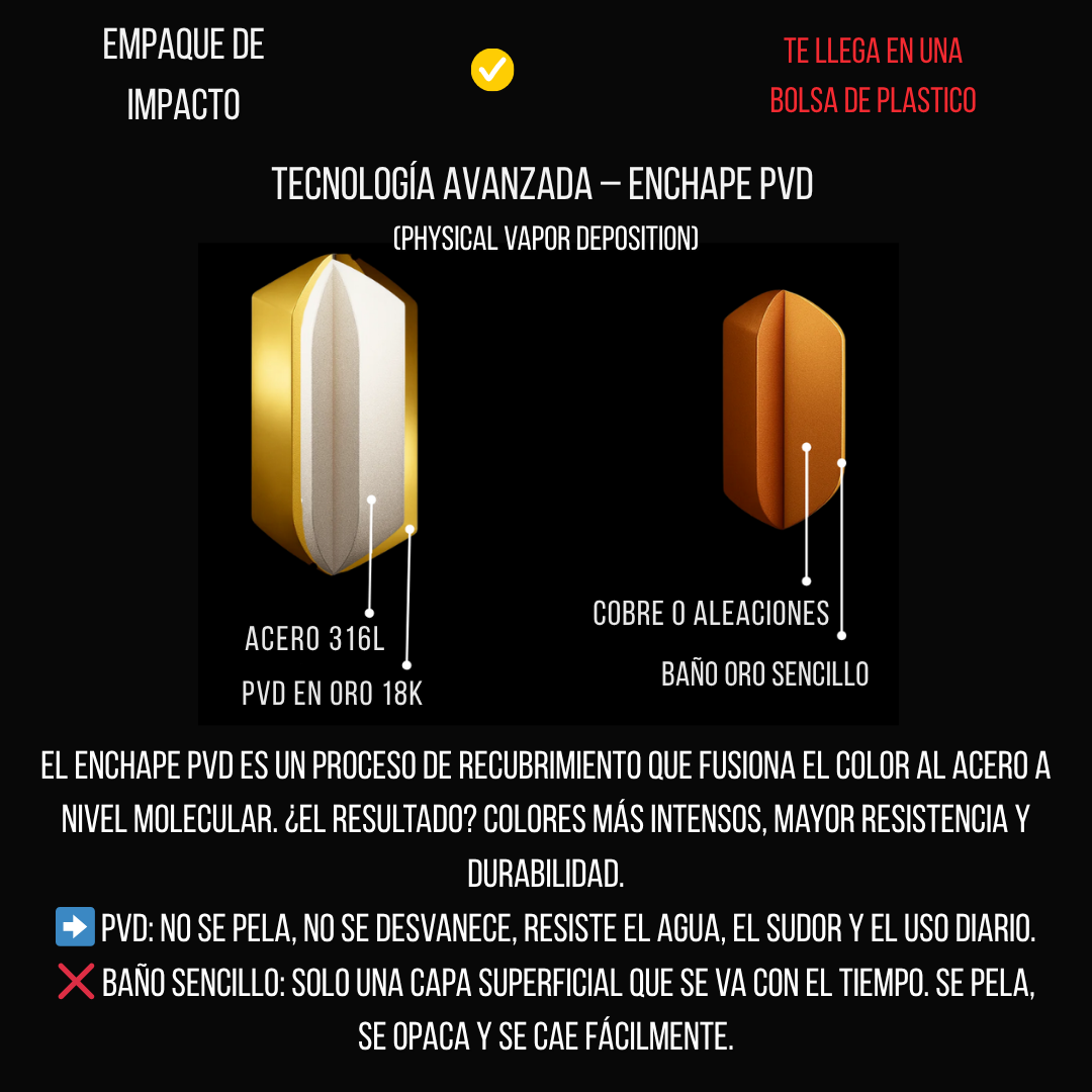 Hecho en acero inoxidable 316L grado quirúrgico de alta resistencia, el mejor acero para joyería del mundo, el color dorado maneja un enchape en oro real de 18k mediante tecnología PVD y sellado con recubrimiento anti deslustre.
